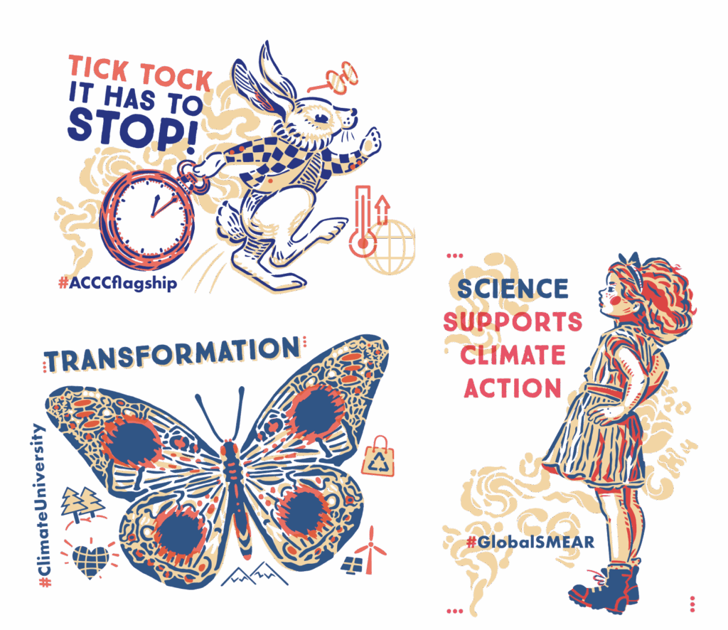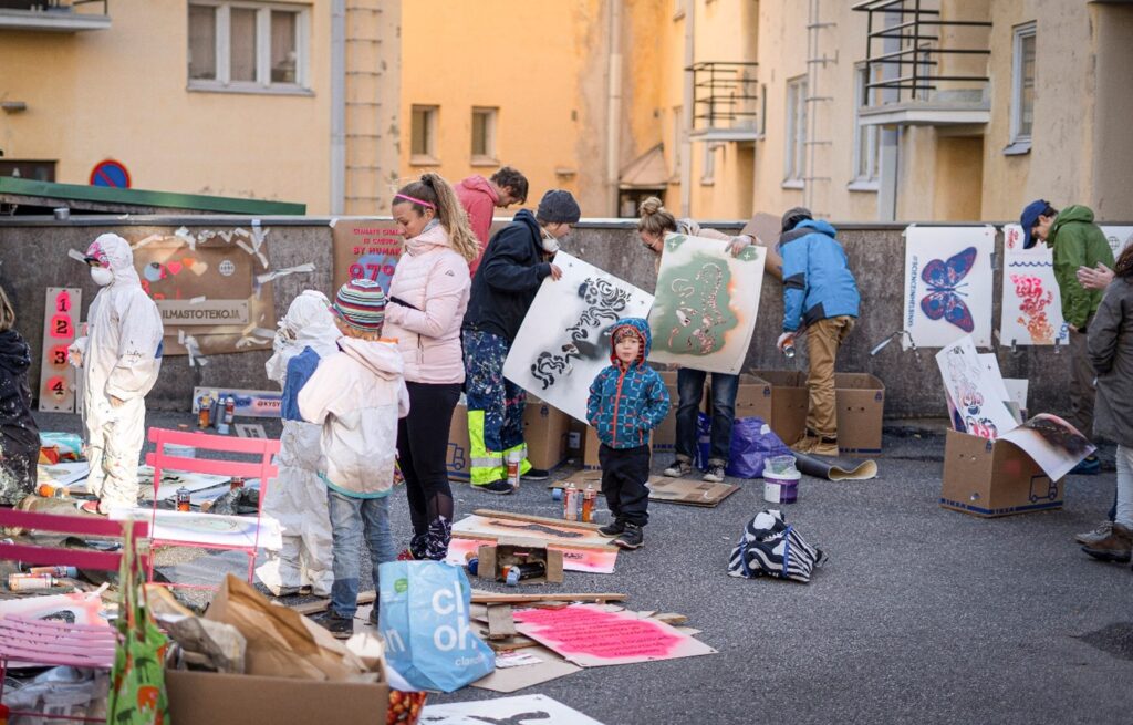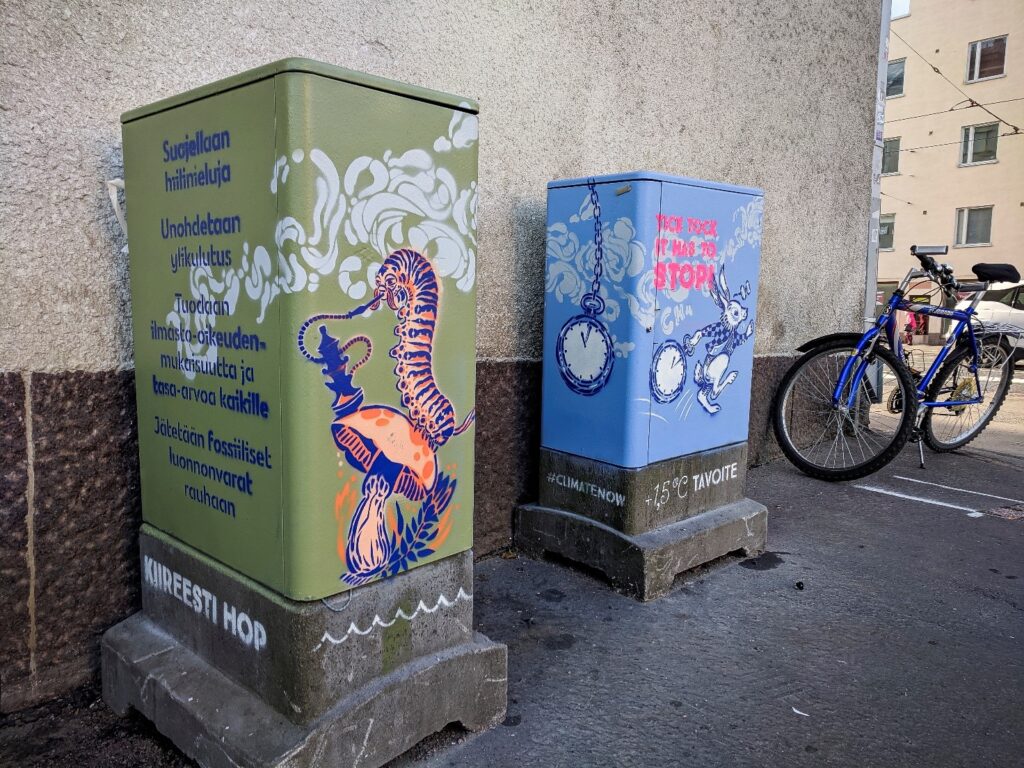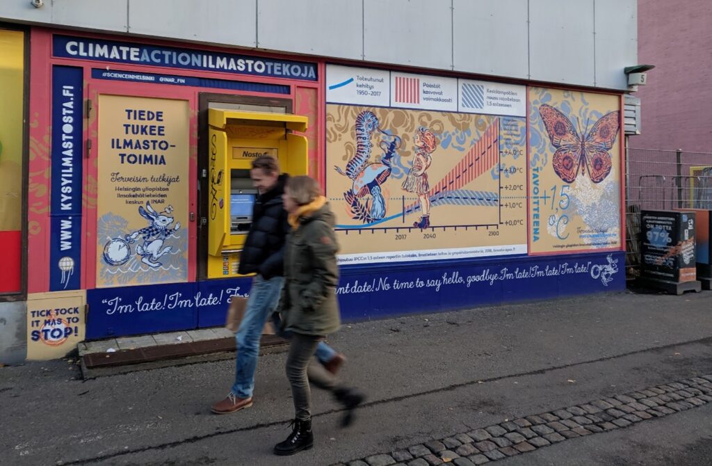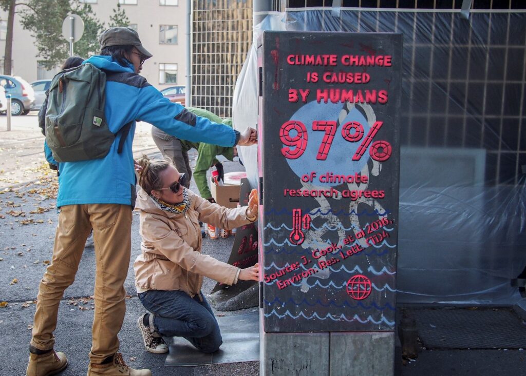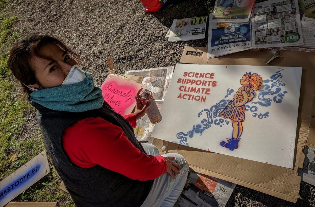 Painting science in Helsinki was an initiative by street artist Maikki Rantala and University of Helsinki researcher Stephany Mazon from the Institute for Atmospheric and Earth System Research INAR in 2019. Atmospheric scientists were invited to co-create visual climate change related messages. Illustrations were designed by Maikki Rantala and cut into stencils. Then scientists, residents, students and activists were invited to join the collaborative workshops together in different urban locations around Helsinki. In addition to painting on the streets side by side residents were able to ask researchers questions related to climate. In 2025, many of the paintings are still visible in the city landscape.